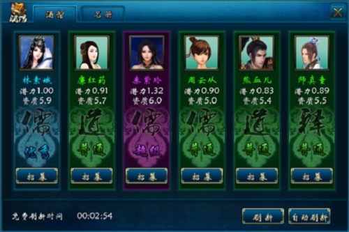 酒馆招将技巧:10级起可招募散仙,每10级增加1名。优先刷出蓝色及以上品质将领,重点关注潜力”与资质”数值,1.1以上潜力者值得重点培养。善用每小时1次的免费刷新,节省仙石资源。