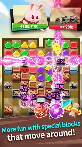 游戏以经典三消为基础,巧妙融入RPG战斗系统。每一次成功消除都会转化为对敌人的伤害,特殊方块还能触发强力技能,助你轻松应对各种怪物与BOSS。随着关卡推进,你将不断升级角色、解锁新技能,并根据战局灵活搭配技能组合,打造属于你的专属战斗流派。