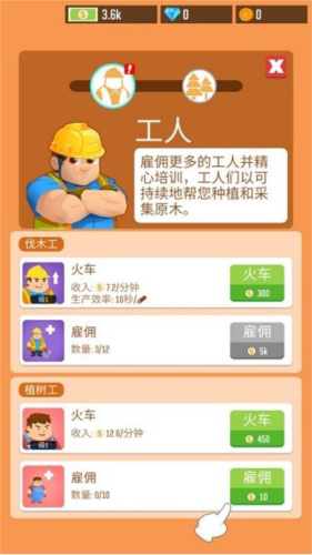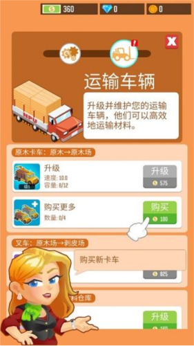 开局建议优先雇佣3名伐木工(点击原木区域进入雇佣界面),他们是获取原材料的核心。记住:没有伐木工,就没有原木!”随后,立即购置原木卡车,打通运输通道。初期资源充足,可同步升级剥皮机等关键设备,大幅提升加工效率。