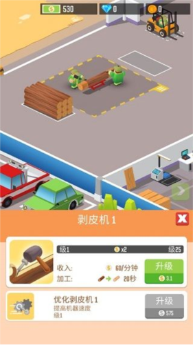 游戏构建了一套完整的木材产业链模拟系统。首先,你需要科学管理森林资源:雇佣伐木工高效采伐,同时配置植树工持续造林,确保原料源源不断。其次,建立并优化铣削加工链——通过购买和升级各类机器(如剥皮机、切割机等),提升原木处理速度与成品产出率。