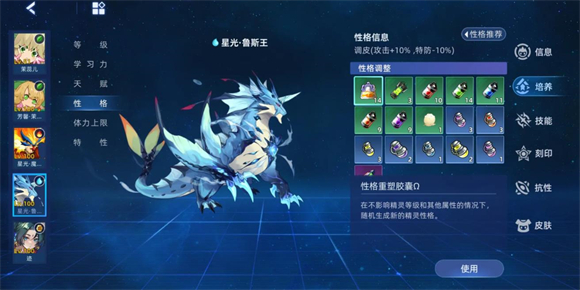 5、性格的话像鲁斯王这类弹伤精灵是例外,一定要减防性格,随便一类减防就可以了,这个不需要变动。防御类精灵随意一个加防就行,这个与改刻印那样灵活变动的(注意:修改道具很容易获取,在资源日常的功勋类商店换取)。攻击类精灵优先选精灵对应类型伤害,扣除相反伤害,次选增伤减速度。精灵是物理伤害还是特攻伤害很容易判断,看看精灵第五技能是什么类型就知道了。