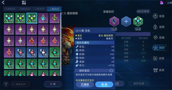 2、刻印的话,防御类精灵就拿图中那样的两角刻印,平常是用三角刻印偃月之云。两角:分别增加体力110与防御55;三角:体力90、物理防御55和特攻防御55.防御的选择由对应BOOS决定,遇到高伤害BOOS需要灵活变动,将防御改成更高的两角刻印并与其BOOS伤害对应的防御。