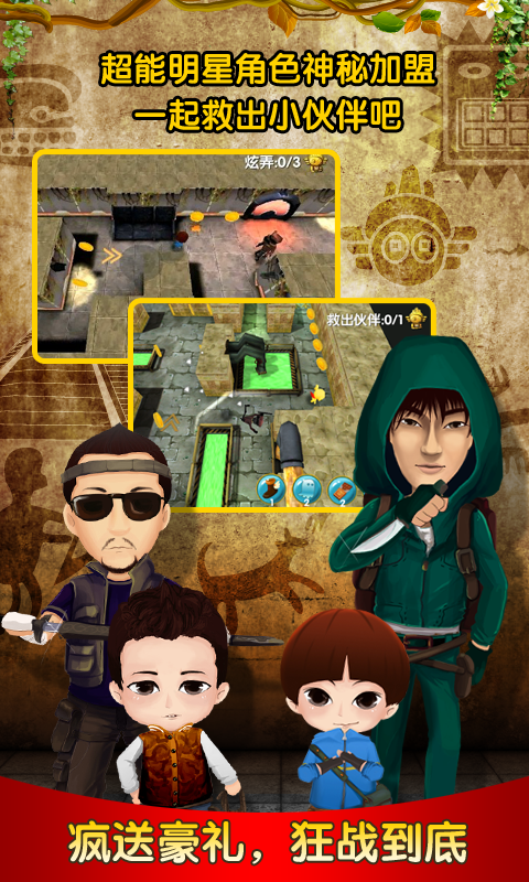 现开放有5大密室,节目中原生场景设计,160多个关卡,关卡难度循序渐进,怪科学家、警卫、机器人怪兽等你来挑战, 更有亮长今、天天、老郭、石头等节目中人气嘉宾化身超能角色助你闯轻松难关!
