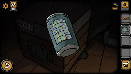 首先点击左下角返回键,回到仓库区域寻找登船工具。最先映入眼帘的是一个带有英文字母和数字标识的易拉罐1,以及一段断开的绳子。