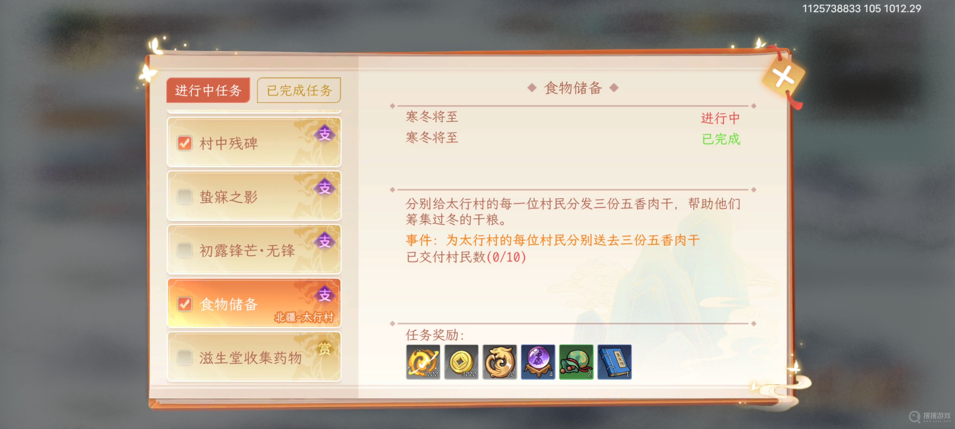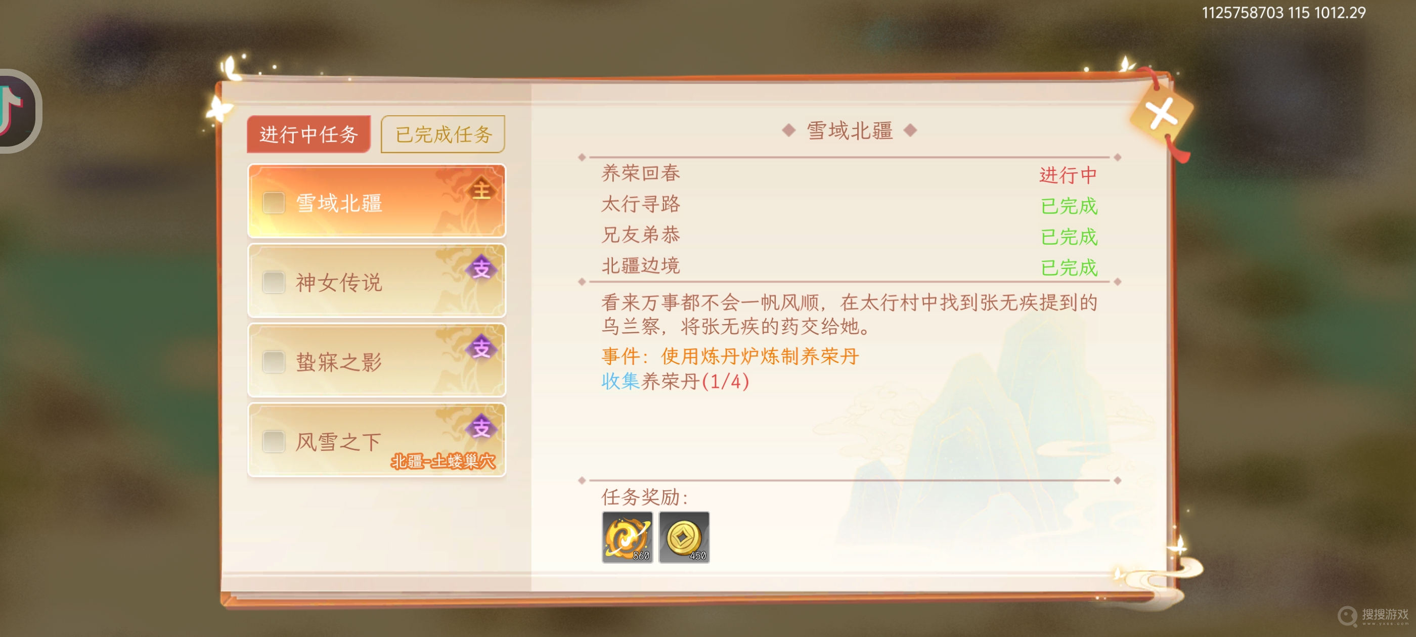 1.主线雪域北疆-养荣回春,需要4份养荣丹,任务介绍见图2.养荣丹材料见图3.玩家需根据图1提前采集好对应材料。