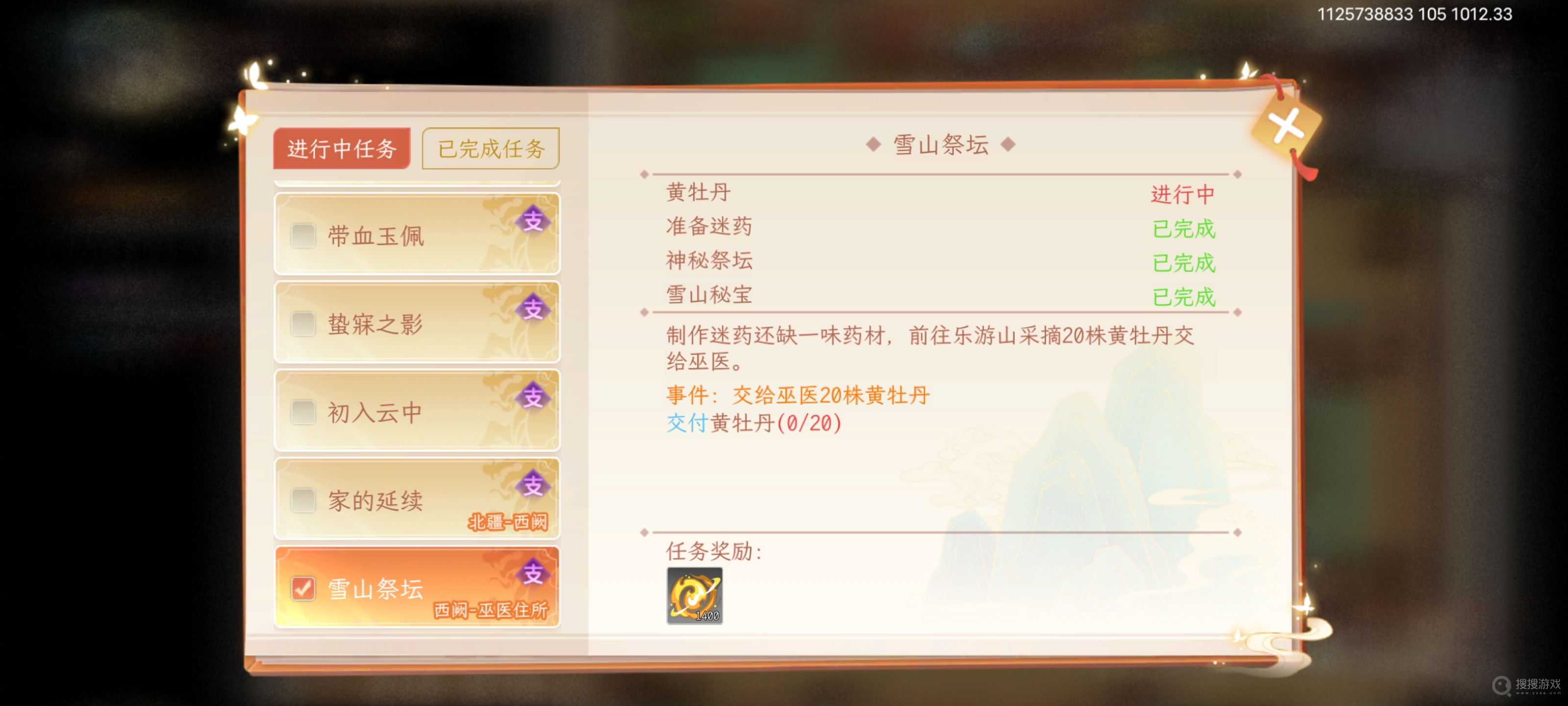4.支线雪山祭坛-黄牡丹,见图7.需要20份黄牡丹,目前地图只有乐游山采集点可以采集,概率低。