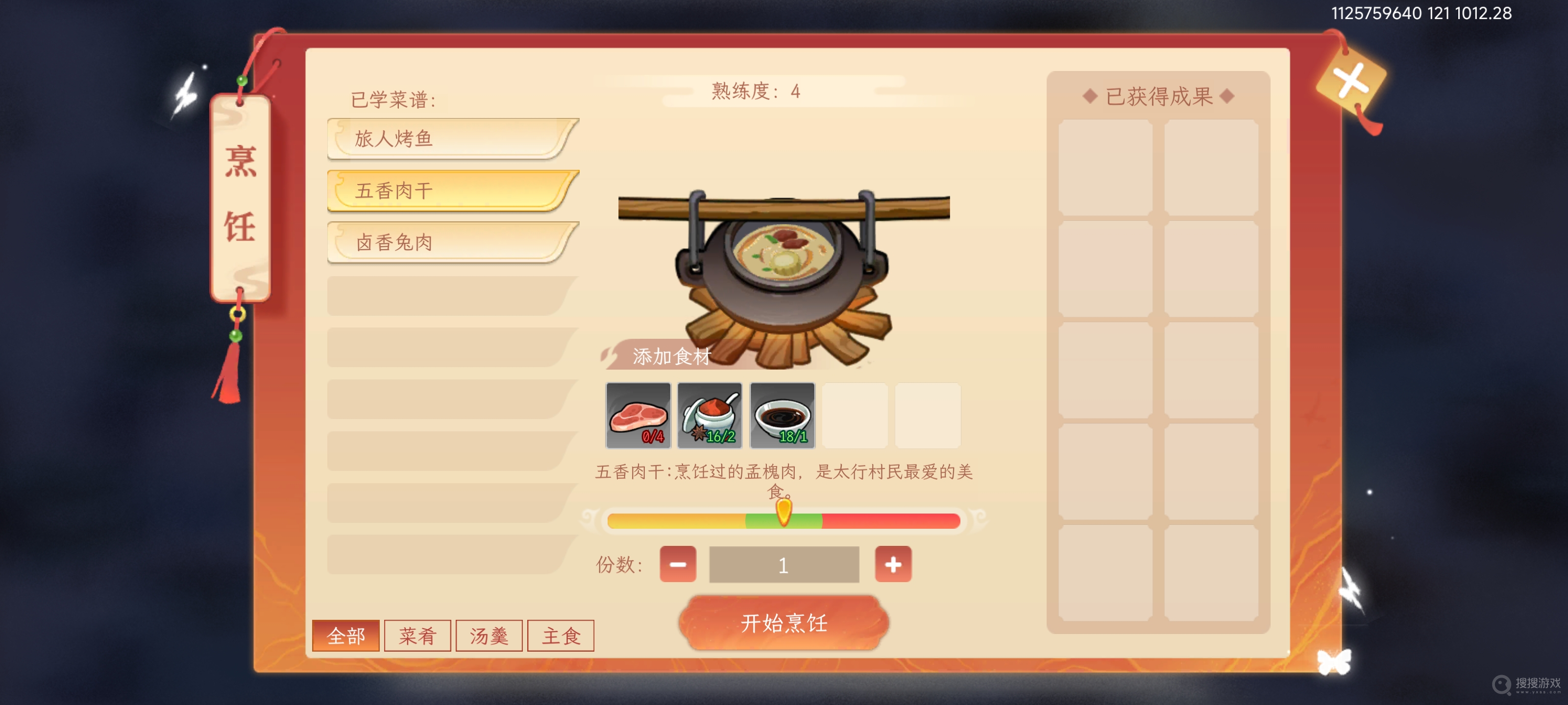 2.支线食物储备,见图4.需要10个村民每人三个共计30个肉干,肉干制作清单见图5.每份肉干需要4份肉2佐料1酱油,一共需要120肉60佐料30酱油。肉是需要打大地图中的刺猬必掉落1肉,打120次需要720精力,佐料和酱油需要去地图城池里的杂货店购买,每个城池每日限购10份。