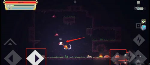 利用虚拟按键控制移动、攻击与跳跃,灵活走位可高效清理小怪。注意观察白色箭头指引,顺利通往下一区域。