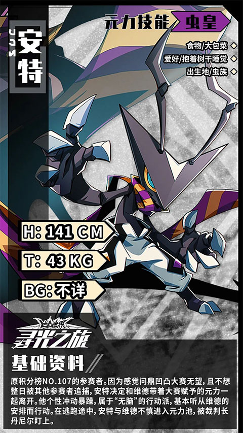 安特,原积分榜NO.107的参赛者。因为感觉问鼎凹凸大赛无望,且不想整日被其他参赛者追捕,安特决定和维德带着大赛赋予的元力一起离开。他个性冲动暴躁,属于无脑”的行动派,基本听从维德的安排而行动。在逃跑途中,安特与维德不慎进入元力池,被裁判长丹尼尔盯上。