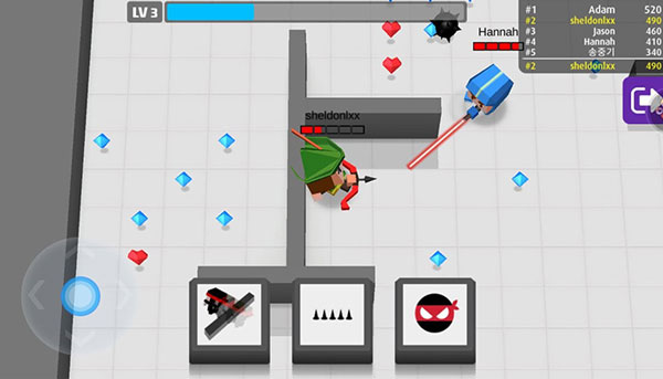 1、通过虚拟摇杆控制走位,利用手中的弓箭击败对手;