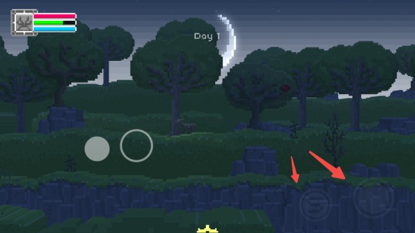 1、游戏开始,点左侧山上有复活石,学习二次跳跃后蹦上去吃,点击红条左侧经验框调出物品栏,拖动2个复活石到使用栏,退出物品栏,选中复活石点击屏幕右侧透明图标使用。