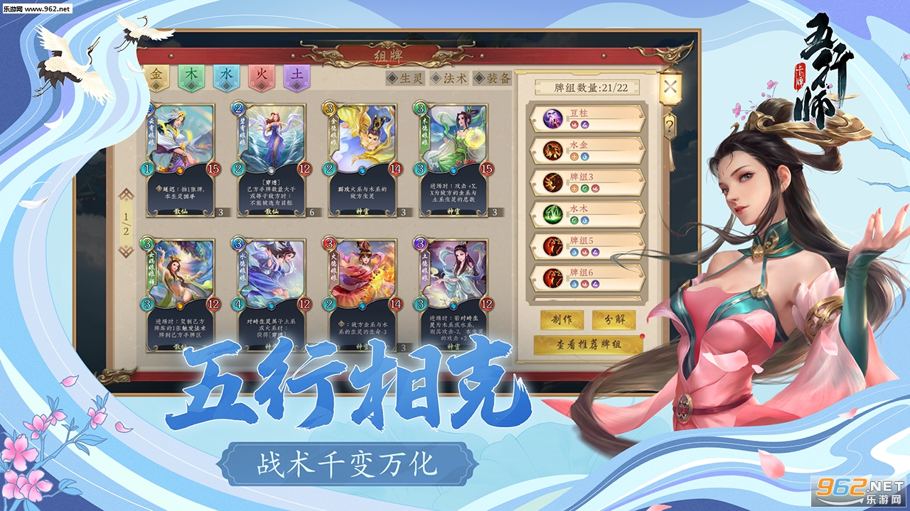 所有卡牌被分成金木水火土五种属性,每一种属性的卡牌都有自己的特色和擅长的打法。