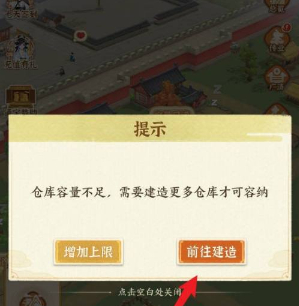 2、点击容量已满”标记就会出现提示,我们选择前往建造”,选择建造新的仓库。