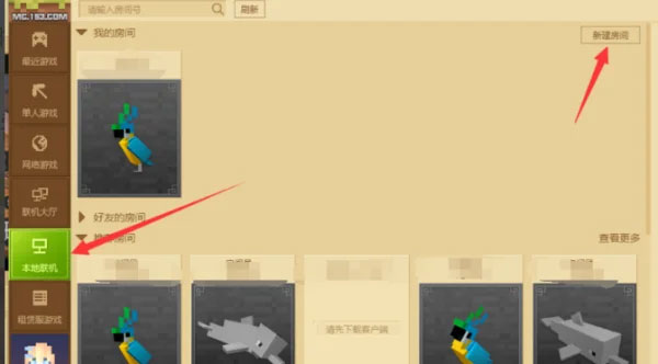 2、在弹出的界面找到本地联机”,然后点击新建房间;