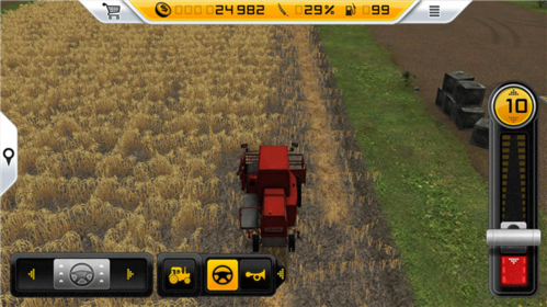 2、但如果你觉得自己的开车技术实在烂的话,小编这里可以教大家一个方法:先把收割机开到小麦附近,然后点击屏幕下方的方向盘按钮”,这样收割机会自动收割小麦。