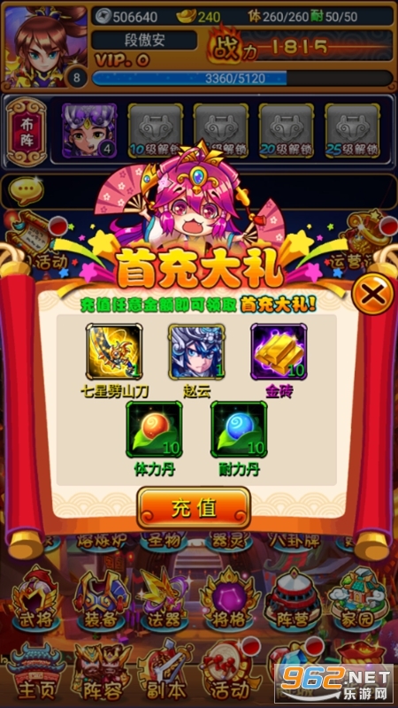 ★首充双倍元宝返利,首充即送神赵云,七星超强武器和金砖;