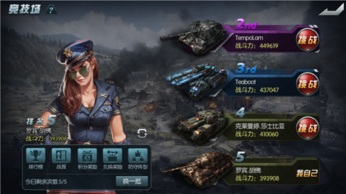 竞技场是检验实力的终极舞台。采用5V5异步对战机制,系统自动模拟战斗过程,确保离线玩家权益,真正实现战力即正义”的公平竞技环境。玩家可手动选择排名相近的对手发起挑战,亦可扫荡低排名玩家快速完成日常任务。战前可查看对方阵容,针对性调整己方坦克配置,利用攻击类型与护甲克制关系抢占先机。此外,竞技场排行榜实时展示顶尖玩家的阵容与战力,而胜利所获的竞技币可在专属商店兑换装备改造材料、坦克碎片及进阶资源,助力持续成长。