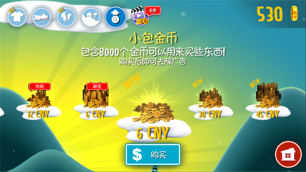 包含8000个金币可以用来买写东西!购买后即可去除广告这个玩法,顺便普及一下游戏币在滑雪过程中收集得到,还可以用来复活等。