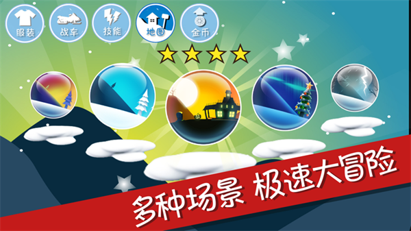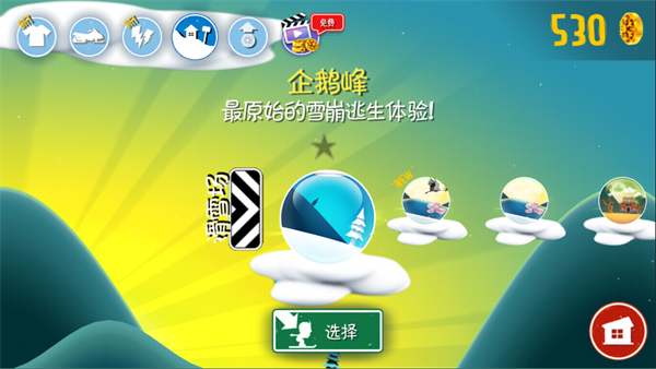 分别有企鹅峰、仙鹤陵、天竺行灯,新的地图有不同的场景,也就是游戏创新的地方--没有雪的滑翔,可以在沙漠、岩浆中滑翔等。地图我们需要收集星星解锁,或者是用游戏币和金币来开启。