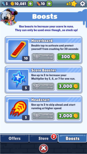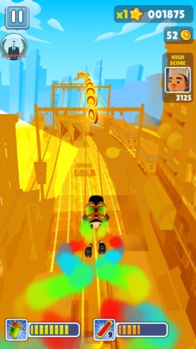 (1)滑板——购买滑板后,在游戏过程中双击屏幕,即可激活滑板,人物承在滑板上进行滑行,并且在有效时间内拥有两条生命。