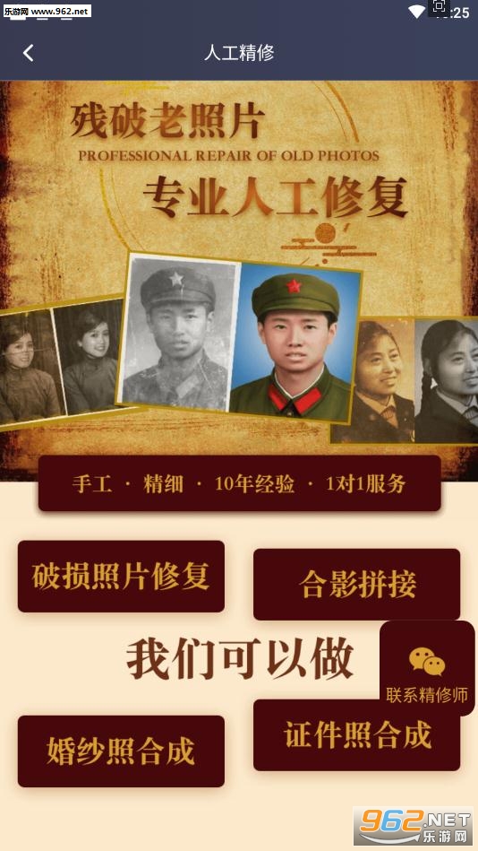 对于破损、划痕、折痕、点或破坏严重的照片,会有专业的人工精修师,手工修复,精修师会最大程度的保留原始照片的形状、细节、神态。精细化处理修复破损照片,让图片变清晰,让照片焕然一新。