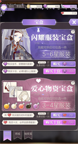 在商场中,玩家可使用钻石购买闪耀服装宝盒或爱心物资宝盒,两者均支持免费抽取(有冷却时间)。累计购买30次后,可任选一件3-6星服装。爱心则可通过舞会表现获得,用于爱心宝盒抽奖。