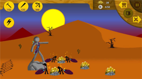游戏前期建议优先发展经济,例如开局派遣8名矿工高效采矿(注意:每座矿最多容纳2人),同时搭配1名矛兵进行防御。面对不同敌人需采用针对性策略:对抗巨人时可利用矛兵吸引仇恨并持续出兵压制;面对法师则需快速突进、优先击杀;而高级剑兵则可被大量弓箭手轻松克制。困难难度下,合理搭配兵种与技能是取胜关键。