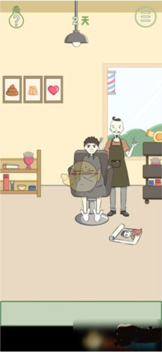 第2关:点击理发师口袋,掉落一幅画;点击地上的画,理发师开始工作,通关成功。