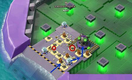 2、摧毁红圈内的防御设施,胖妹从右侧登陆,先拆掉狙击塔,再用震爆弹清理两个迫击炮后便可直捣黄龙。