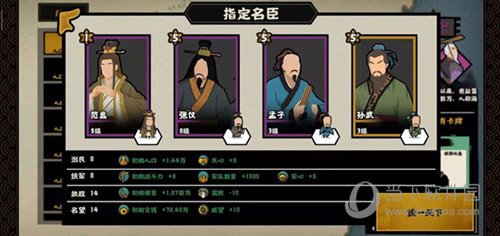 2、这一套搭配的名臣是范蠡,张仪,孟子,孙武,其核心是张仪,范蠡,孟子,他们三个技能相辅相成,张仪的连横可以提高他国好感度,前期就可以疯狂结盟,来触发范蠡和孟子的技能获得极高的钱粮产量提升,孙武的风林火山技能出征胜利即可获得威望,威望大于七十的时候,还能触发自己和张仪和范蠡的用间技能,提高战斗力和用间等级,在春秋战国是十分重要的,这套搭配,能在前期带来极高的钱粮收益,不用担心钱粮短缺,且这套搭配几乎没有任何负面效果,虽然孙武粮草技能会消耗大量粮草,但在其整体搭配带来的钱粮收益面前基本就忽略不计。