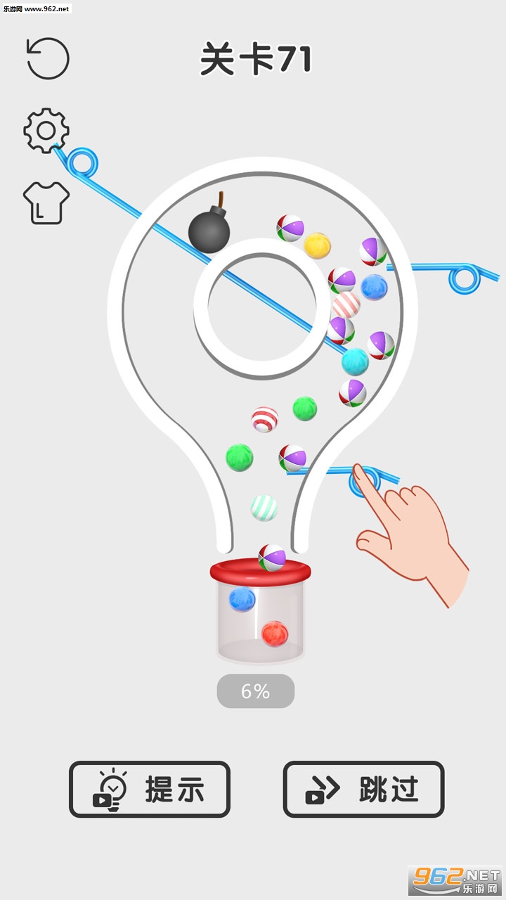 《拉针我最牛》是一款根本停不下来的游戏,操作简单又不失可玩性,每一关中都有几根别针,还有散落在各个地方的小球,点击别针即可移除别针,可别随便点击哦,别针移除的顺序直接影响到你的游戏成败,用有颜色的小球去接触没有颜色的小球即可把球染色,将所有球染色然后全部落入到下边的桶中即可胜利,温馨提示:别让小球碰到炸弹哦,不然你就会听到boom的一声,结局就不用我说了吧。游戏中还有很多有意思的元素,快来动动脑看看你能不能解决这些脑洞十足的关卡吧。