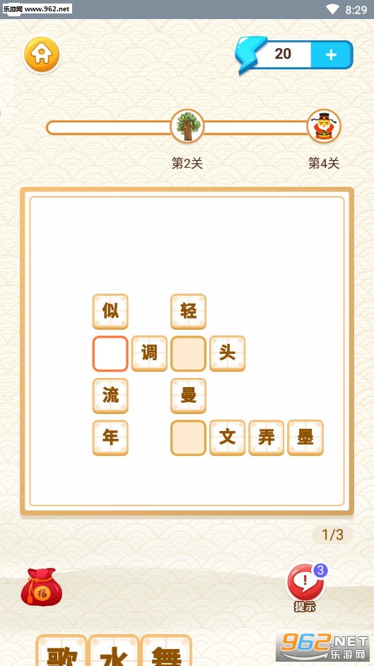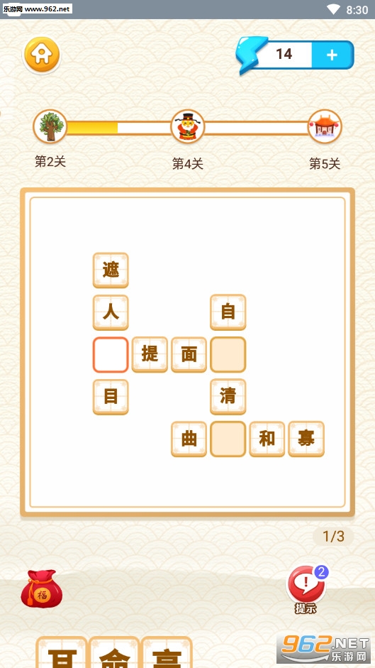 趣味的益智闯关游戏,游戏加入了成语、诗词、脑筋急转弯、猜字谜等众多的玩法,需要在空白的地方选择正确的答案,可以点击旁边的提示按钮进行提示,喜欢的朋友可以下载试试。