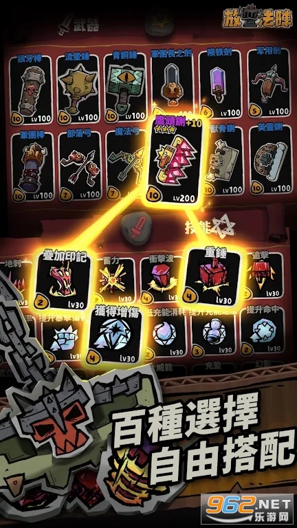 匕首、剑、弓箭、锤、鉔等多样武器、百种技能任你搭配