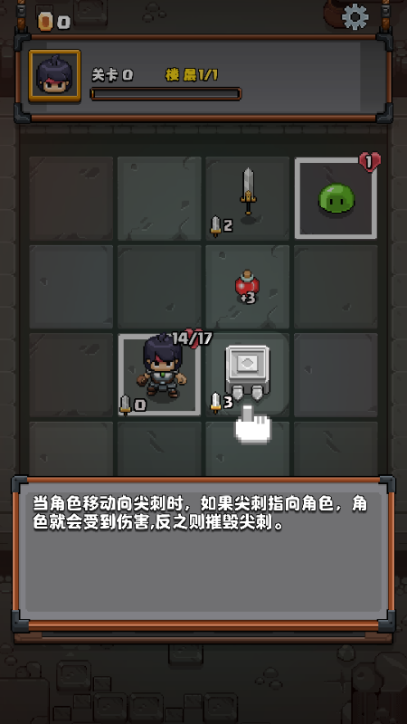 4、当角色移动向尖刺时,如果尖刺指向角色,角色就会受到伤害,反之则摧毁尖刺。