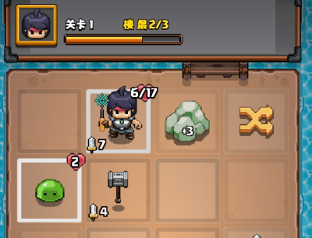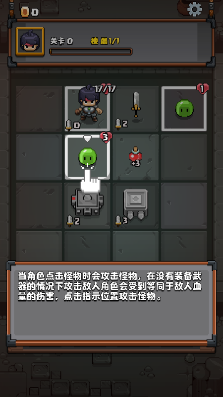 2、当角色点击怪物时会攻击怪物,在没有装备武器的情况下攻击敌人角色会受到等同于敌人血量的伤害,点击指示位置攻击怪物。