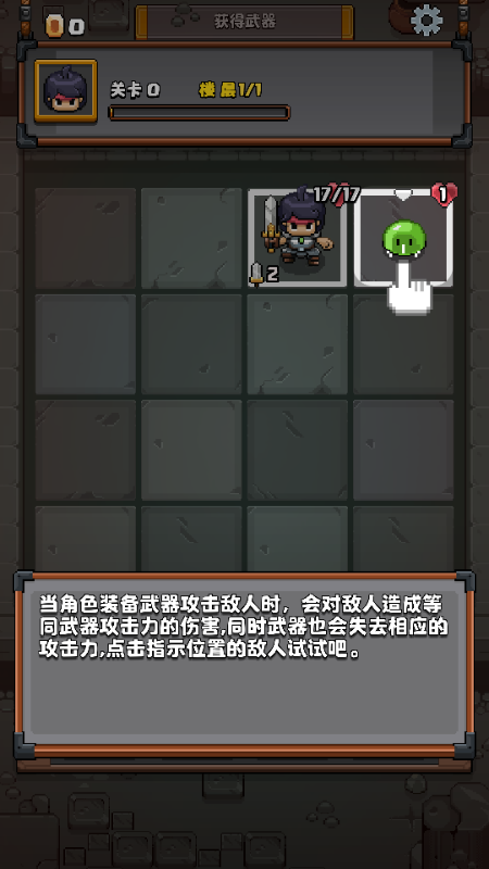 7、当角色装备武器攻击敌人时,会对敌人造成等同武器攻击力的伤害,同时武器也会失去相应的攻击力,点击指示位置的敌人试试吧。