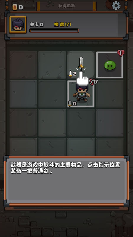 6、武器是游戏中战斗的主要物品,点击指示位置装备一把普通剑。