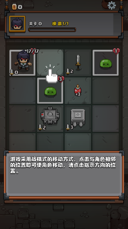 1、游戏采用战棋式的移动方式,点击与角色相邻的位置即可使角色移动,请点击指示方向的位置。