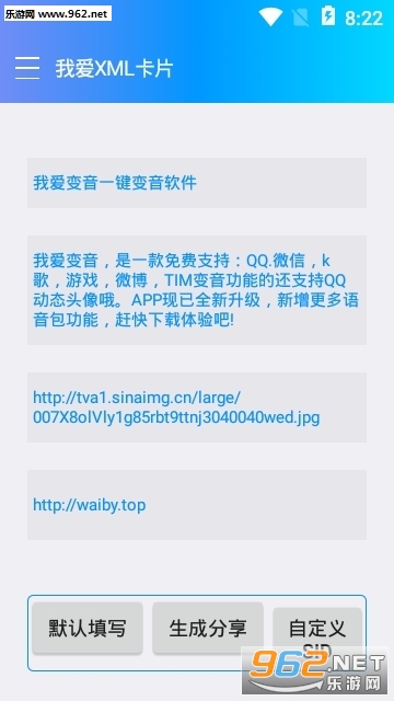 《华雨卡片生成app》是一款恶搞装逼神器,可以用来整蛊你的朋友,将xml,json代码转化成卡牌的形式,输入各种有趣的文字卡片,发给你的小伙伴,整蛊他,操作比较简单,还有多种模式任你切换!赶紧下载吧!