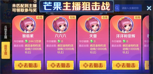 想与网红主播一较高下?只需在首页点击主播赛”,输入从直播间获取的专属参赛码即可入场。更可主动选择心仪主播发起狙击战”,成功击败对方即可赢取其金豆奖励。自由匹配机制让每一场对决都充满悬念与互动乐趣。