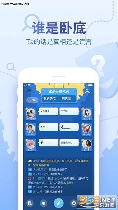 现在!我们把谁是卧底从线下搬到线上来啦!你可以畅快地和网上的卧底小伙伴大战300回合!实乃宅女们居家旅行、无聊消遣必备App!