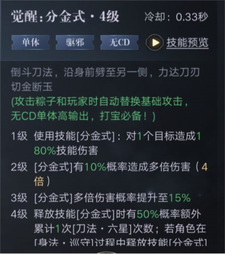 针对强攻摸金”职业,经百次地宫实战验证,最优输出配置为:仅携带普攻技能【分金式】,卸除其他主动技能。该技能具备三大优势:15%概率触发5倍穿刺”伤害;50%概率额外累计【刀法·六星】计数;配合被动可稳定触发流血效果。 【刀法·六星】每5次技能释放触发150%伤害加成的连击”; 【刀创】则对流血目标造成最高60%额外伤害,且六星触发时必定附加流血。 三者联动形成高效循环,使【分金式】单技能流在地宫、巢穴、围猎及烛九阴等副本中输出最为稳定且峰值更高。