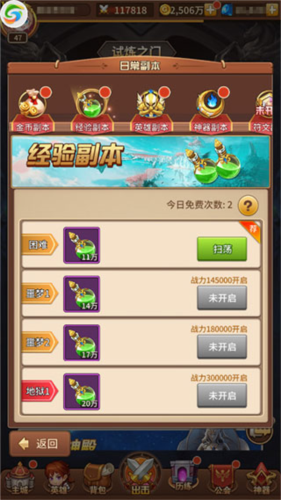 日常副本:每日2次免费挑战,难度越高经验越多,推荐指数★★★★★。