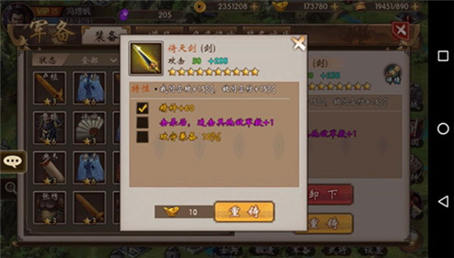 装备是提升战力的关键。在军备”界面,玩家可对兵器进行卸下、强化、重铸或出售。已装备的物品无法直接出售或分解,确保养成安全。