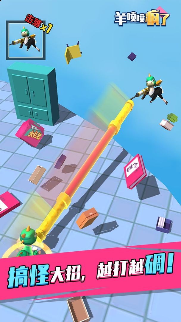 羊喷喷疯了是一个休闲益智类趣味游戏,玩法非常无厘头而且非常解压,利用手中的武器将你见到的每个人打飞.边打还边躲.魔性大乱斗,小心别挨揍!