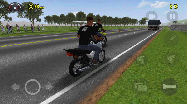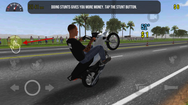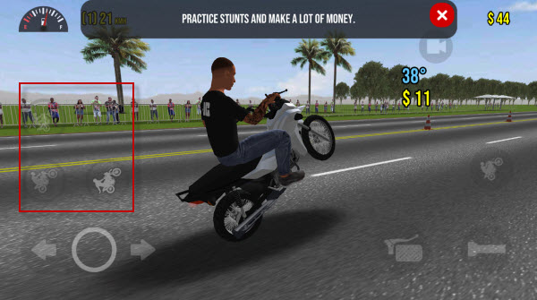 1、游戏过程中,点击屏幕左下方按钮可以让摩托车前轮抬起,进入翘头状态。