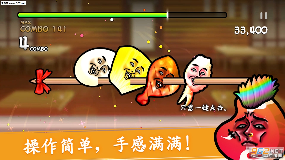 在本作中玩家将会用签子将有着恶搞表情的食物们串起来。