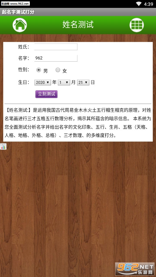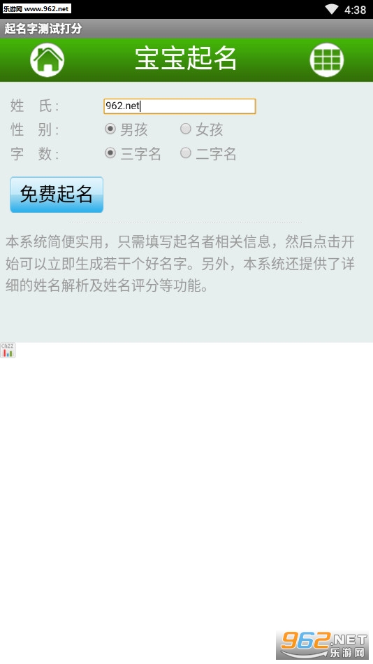 本应用提供了在线免费的起名字功能,简便实用,只需填写起名者相关信息,然后点击开始可以立即生成若干个好名字。本应用最大特点是还提供了详细的姓名解析及姓名测试打分等功能。