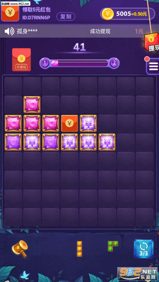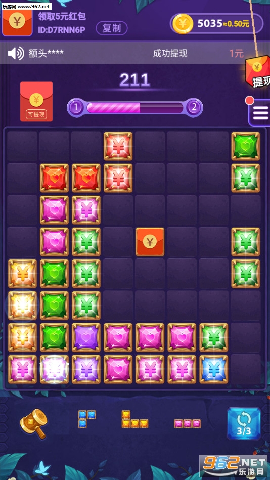 趣味的消除游戏,玩家需要找准方块摆放的位置,通过消除来赚取红包奖励,新人注册还有着新手红包领取,不仅可以玩游戏打发时间还可以赚钱,喜欢的朋友可以下载试试。