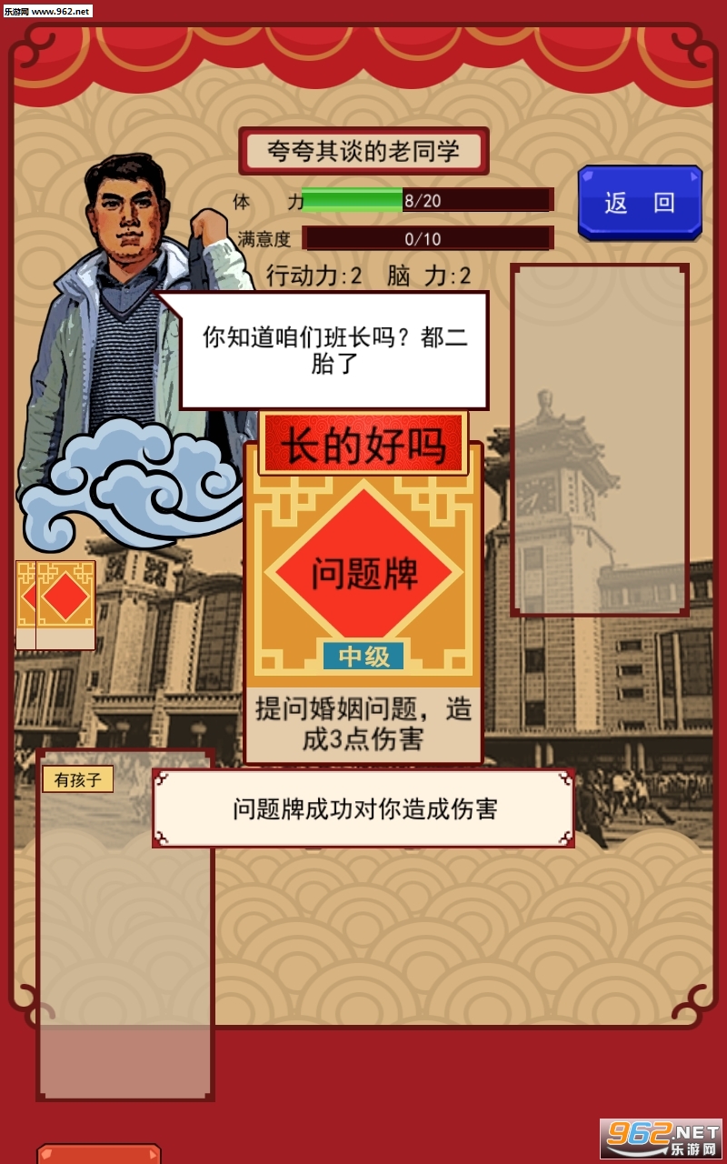 玩法还挺有意思的一款休闲游戏,以春节为主题,玩家在游戏中通过询问各种问题来给其他人早上上海,争取快点把他们的体力耗尽。